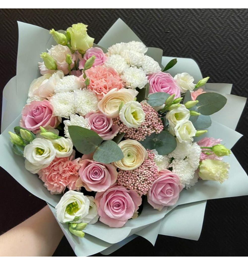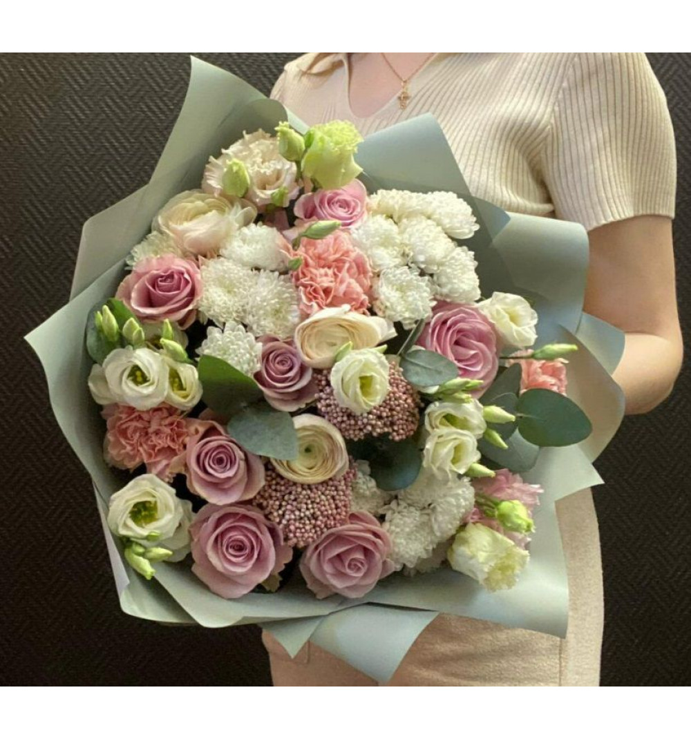 Изысканный букет в мягких сиренево-серых тонах, украшенный эвкалиптом, представлен в стильной дизайнерской упаковке. В составе присутствуют прекрасные цветы: лизиантус, озотамнус, диантус, сантини, ранункулюс и одноголовые розы. Эта уникальная композиция приносит нотки романтики и элегантности, станет прекрасным подарком для особых моментов, чтобы подчеркнуть важность и красоту этого дня.