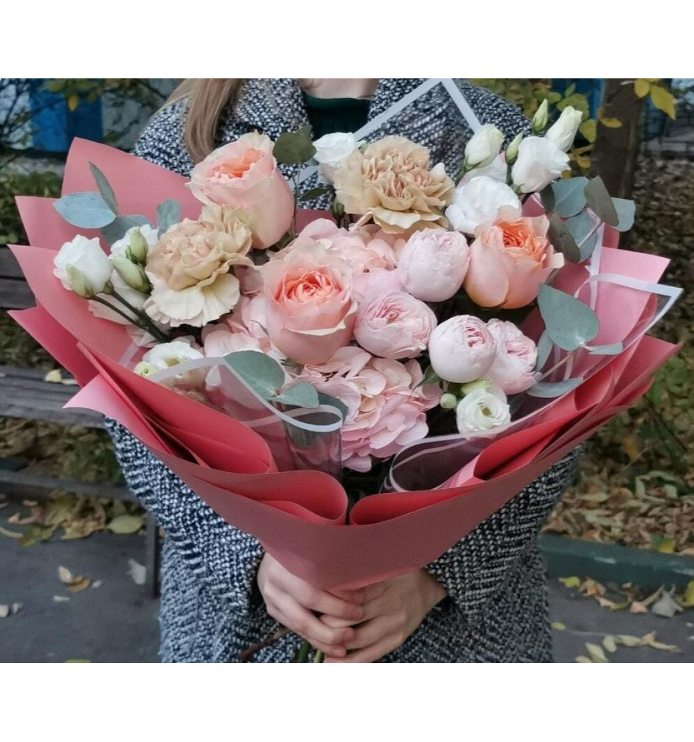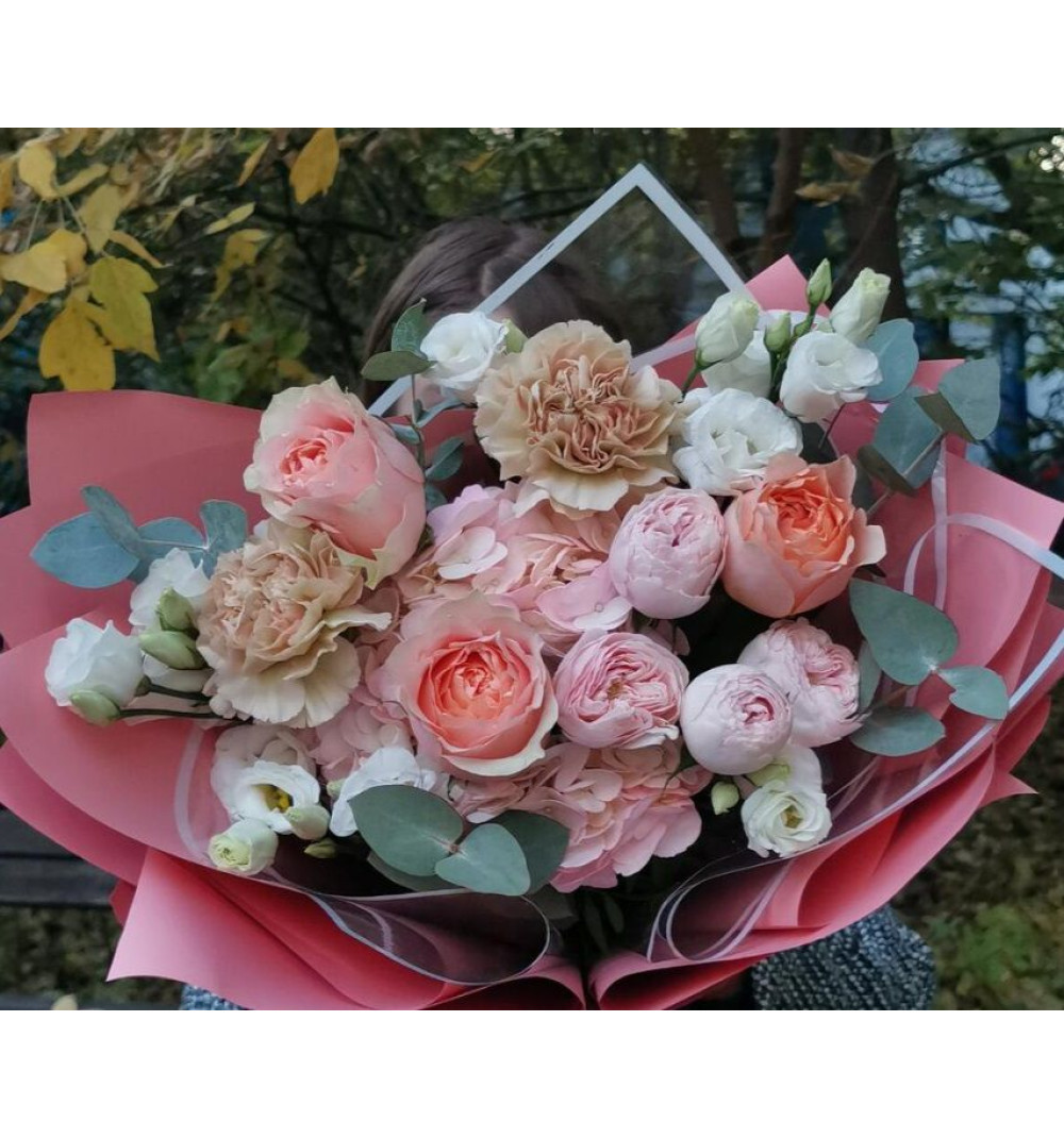 Нежный букет с пионовидными розами Гравити, Мэнсфилд и гортензией